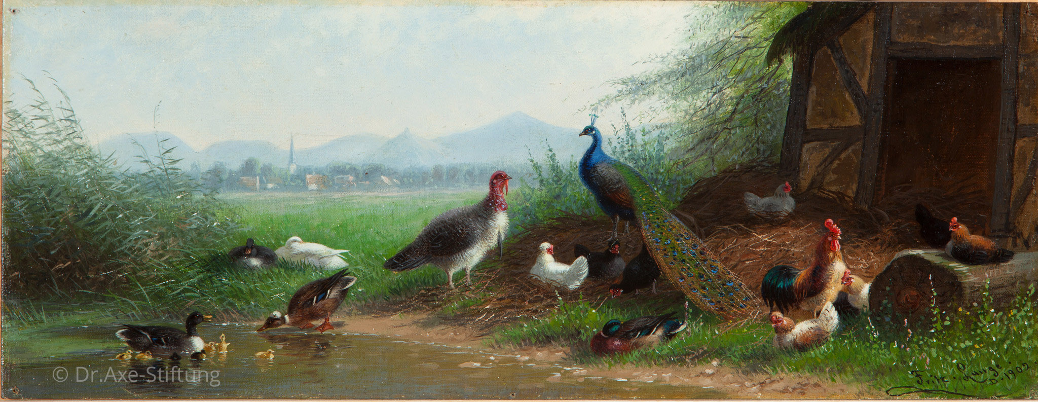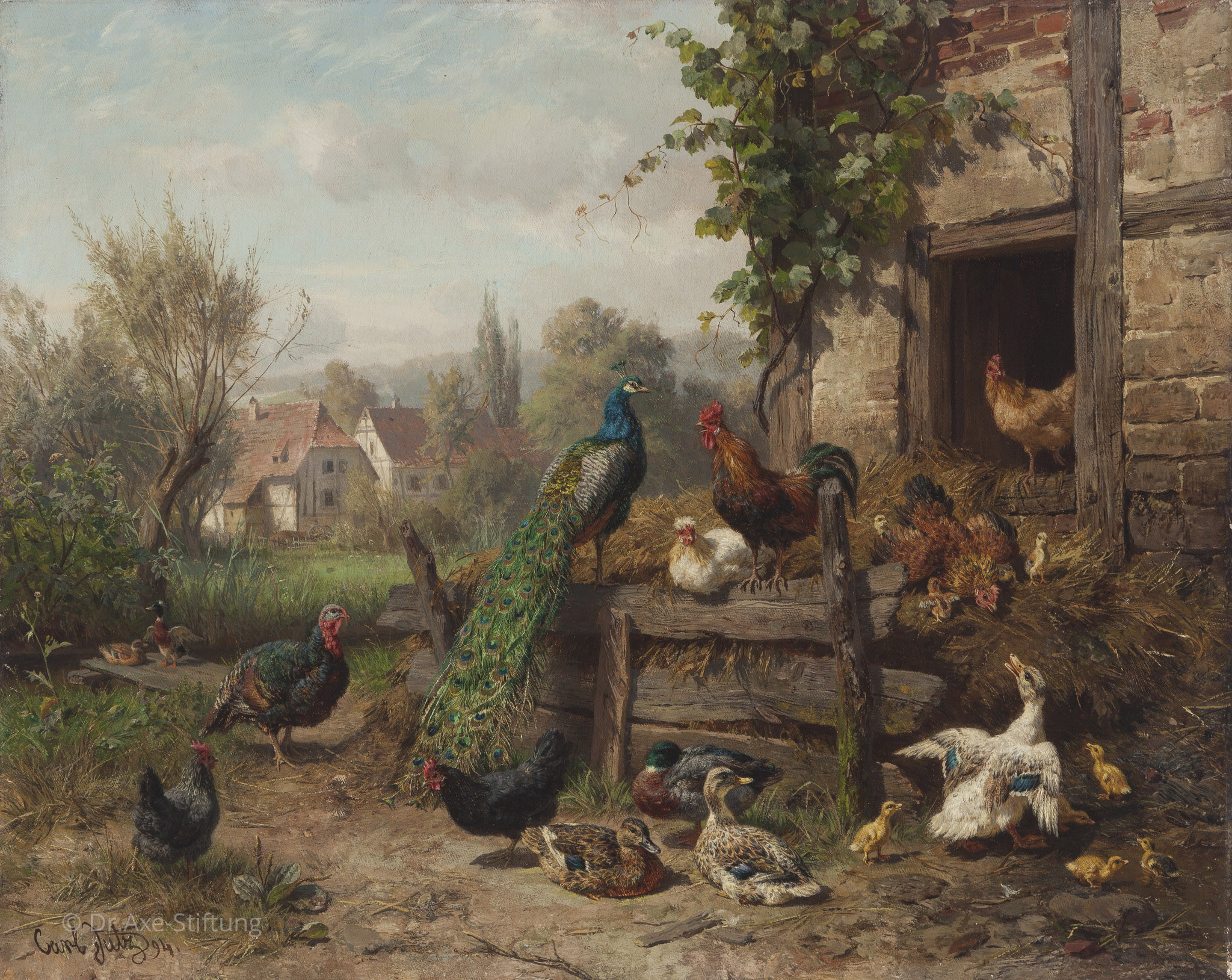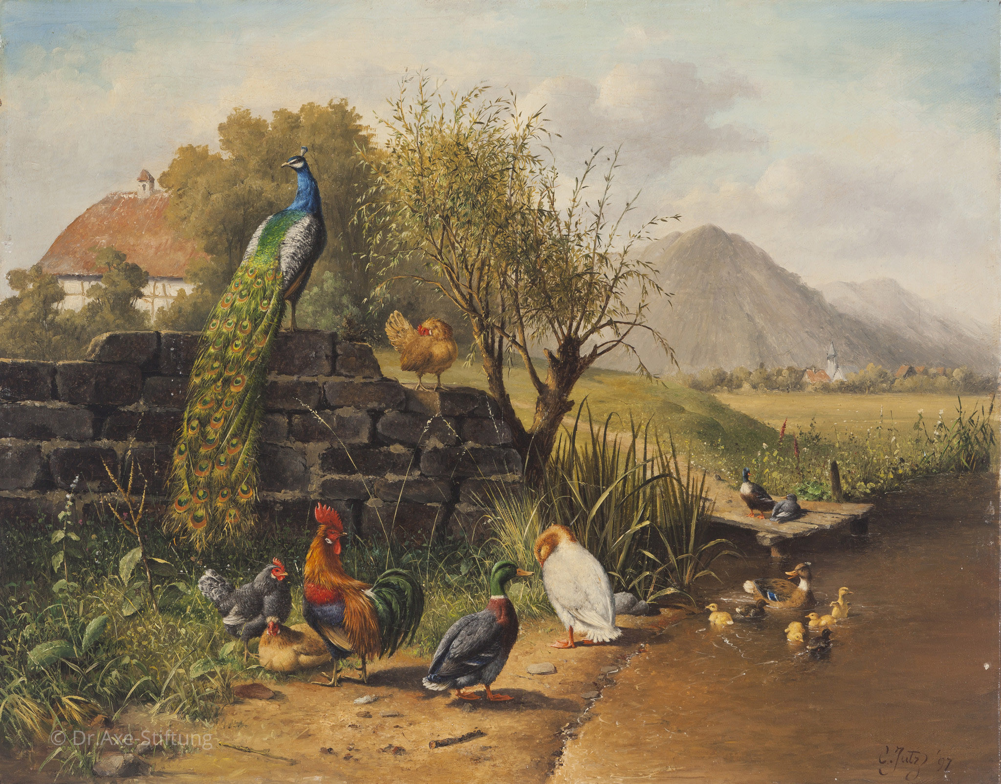 Die Darstellung von Entenweihern, Hühner- und Geflügelhöfen erfreute sich in der Düsseldorfer Tiermalerei bis weit ins 20. Jahrhundert hinein großer Beliebtheit. Künstler wie Carl Jutz d. Ä. und in seiner Nachfolge Fritz Lange waren auf diese Gattung spezialisiert. Jutz hielt im Garten seines Hauses eigene Tiere, um deren Anatomie und Federkleid ebenso studieren zu können wie deren Bewegungsabläufe und Verhaltensweisen. Tote Tiere wurden präpariert und dienten Jutz im Atelier als Requisiten. Der Erfolg seiner Bilder hatte sicherlich mehrere Gründe: Zum einen wurde die hohe malerische Qualität bewundert, zum anderen regten die Arbeiten zum Schmunzeln und zu geistreicher Unterhaltung an.