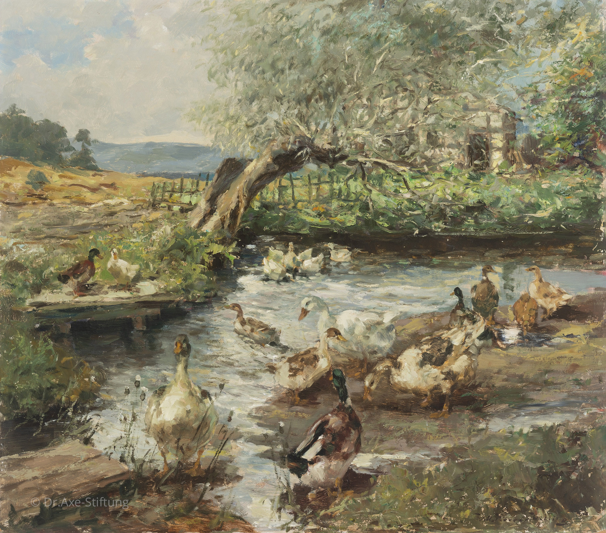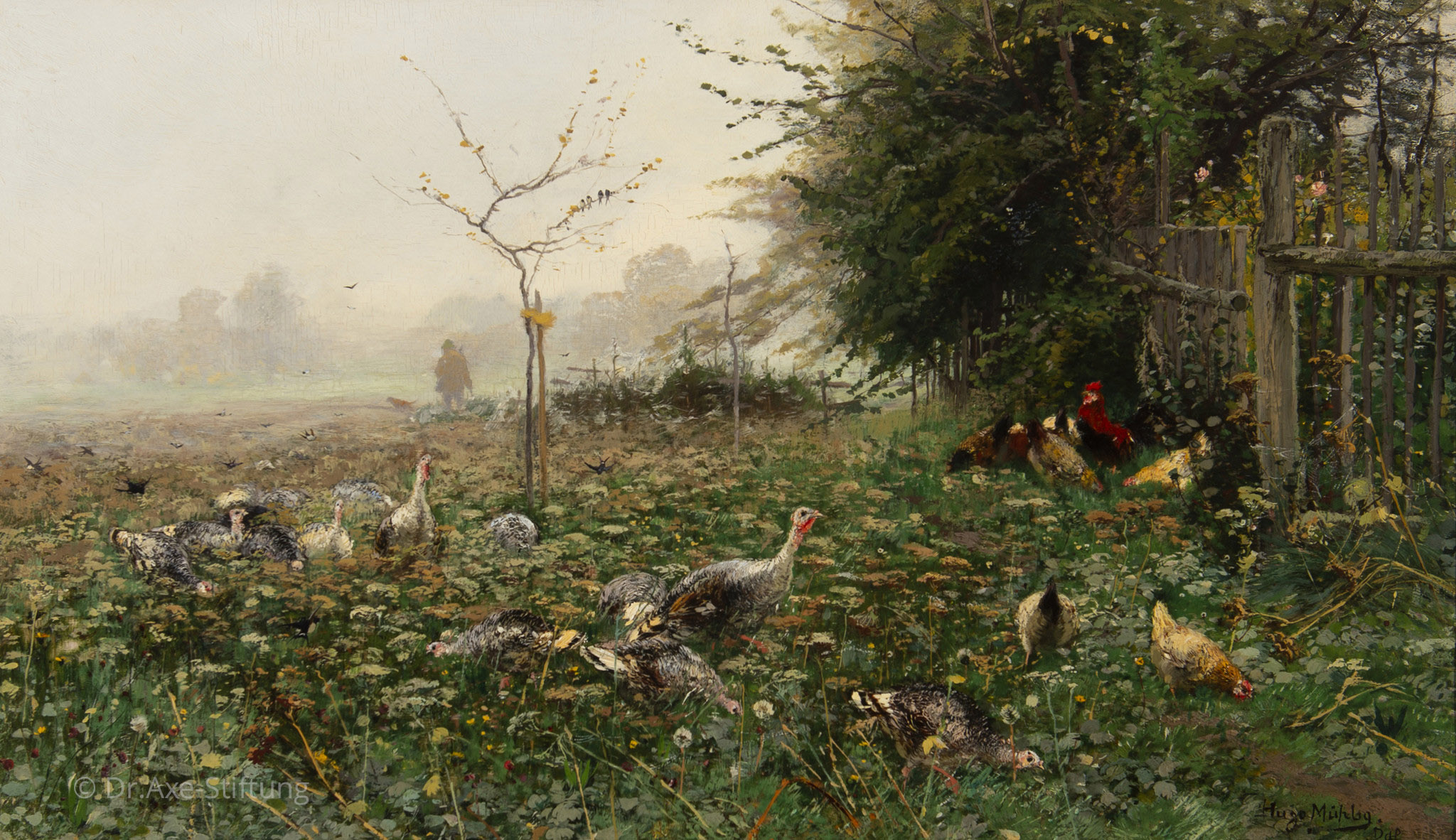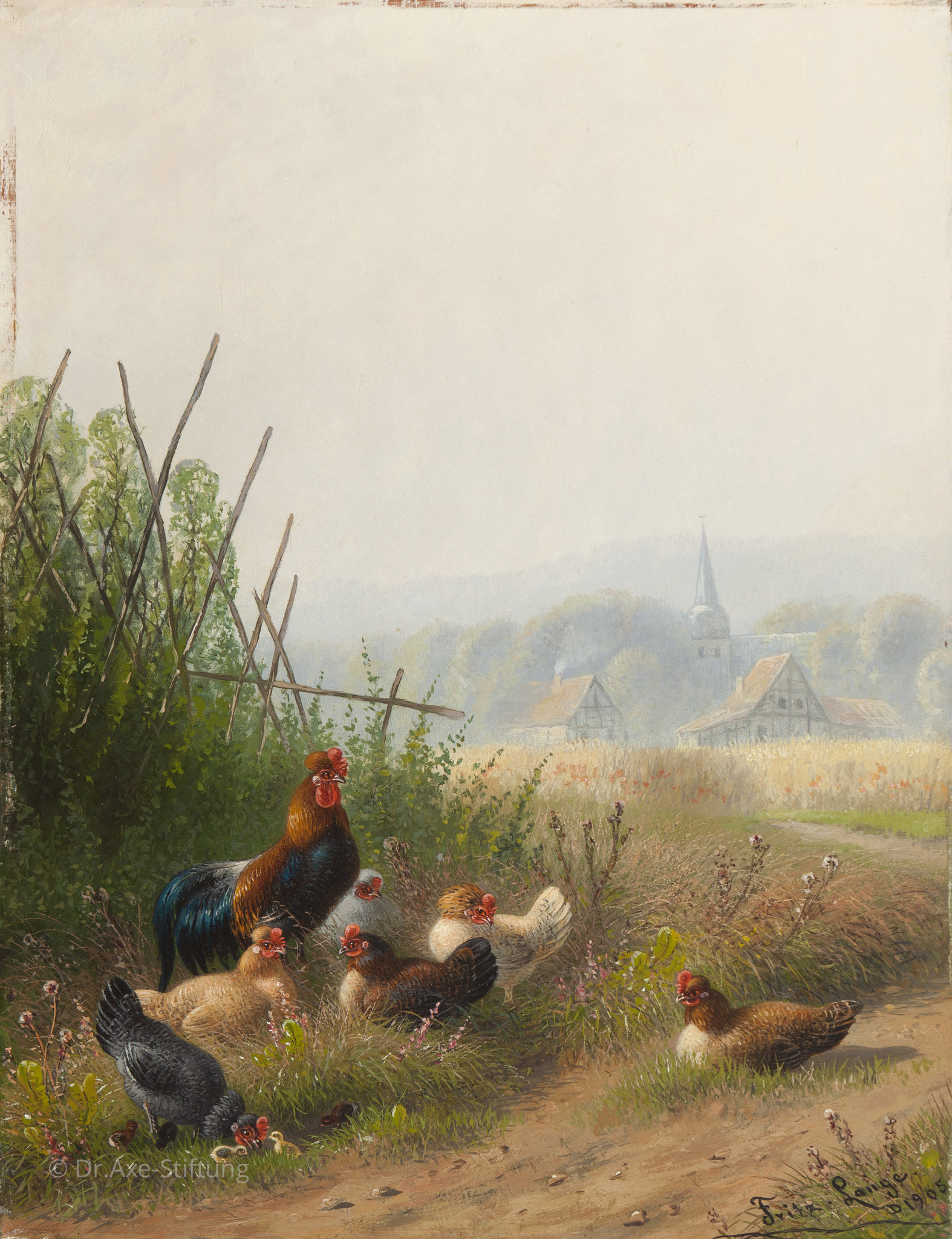 Die Darstellung von Entenweihern, Hühner- und Geflügelhöfen erfreute sich in der Düsseldorfer Tiermalerei bis weit ins 20. Jahrhundert hinein großer Beliebtheit. Künstler wie Carl Jutz d. Ä. und in seiner Nachfolge Fritz Lange waren auf diese Gattung spezialisiert. Jutz hielt im Garten seines Hauses eigene Tiere, um deren Anatomie und Federkleid ebenso studieren zu können wie deren Bewegungsabläufe und Verhaltensweisen. Tote Tiere wurden präpariert und dienten Jutz im Atelier als Requisiten. Der Erfolg seiner Bilder hatte sicherlich mehrere Gründe: Zum einen wurde die hohe malerische Qualität bewundert, zum anderen regten die Arbeiten zum Schmunzeln und zu geistreicher Unterhaltung an.