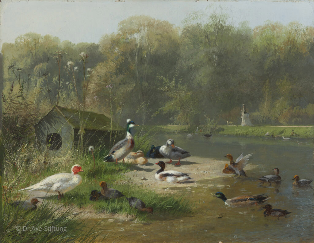 Die reich bevölkerte Uferszene „Enten am Teich“ zeigt ein besonders buntes Repertoire an Teichvögeln, dass auf eine intensive Naturbeobachtung Fritz Langes schließen lässt. Im Hintergrund führt eine feine Dame ihren Hund spazieren. Sie trägt die für eine Frau des 19. Jahrhunderts übliche Tournüre (Kissen über dem Gesäß), wodurch ihre ausladende Kontur an eine Ente denken lässt, was sicherlich kein Zufall ist, denn Lange hatte Humor.