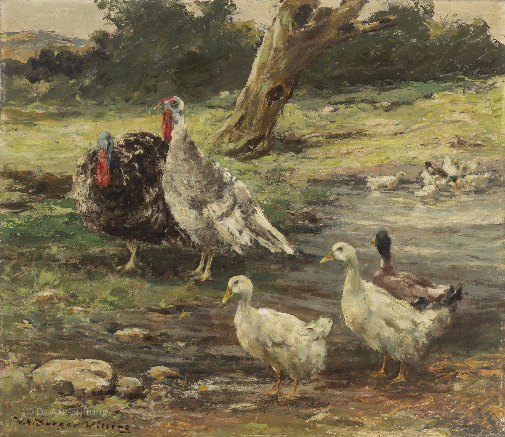Die Komposition konzentriert sich ganz auf die Darstellung der Tiere im Vorder- und Mittelgrund. Dargestellt sind zwei weiße Hausenten und ein farbiger Erpel im seichten Wasser. Die linke Bildhälfte dominieren ein Truthahn mit schwarz-braunem Gefieder und eine Pute mit weißem Federkleid. Ihre charakteristischen roten Hautlappen an den Schnäbeln bilden reizvolle Farbkontraste zu den Beige-, Braun- und Grüntönen des Bildes.
