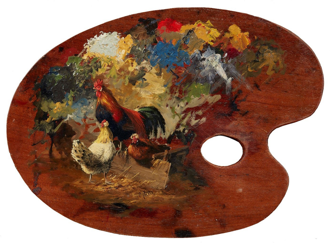 "Palette mit Farbresten und Darstellung eines Hahns und zweier Hennen"
