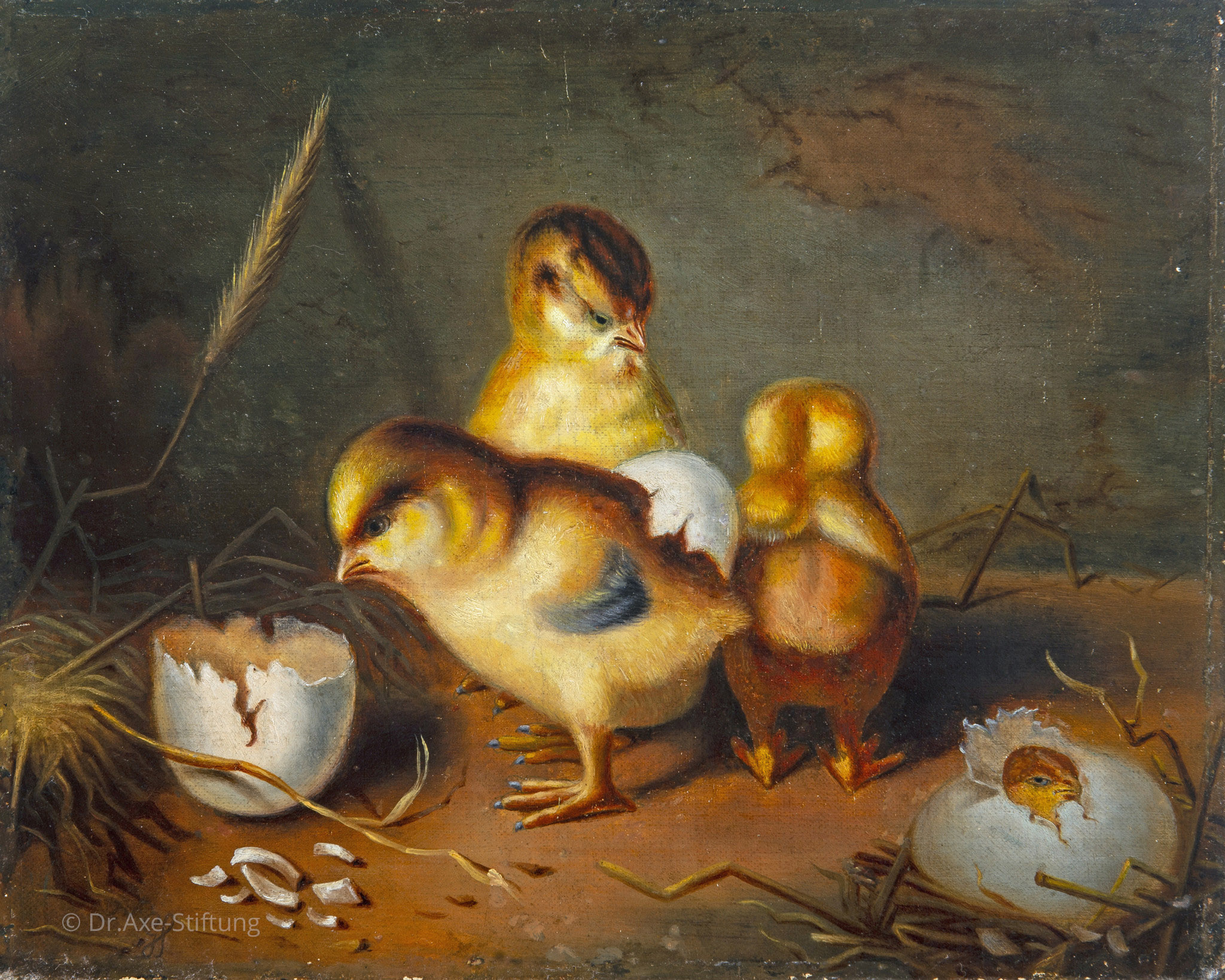 Bemerkenswert im Bestand der Dr. Axe-Stiftung ist eine Palette von Carl Jutz d. Ä., die umgeben von Farbresten einen prächtigen Hahn und zwei Hennen zeigt. Das Bild entstand wohl aus einer spontanen Laune des Künstlers heraus und zeigt, wie souverän er malten konnte.
