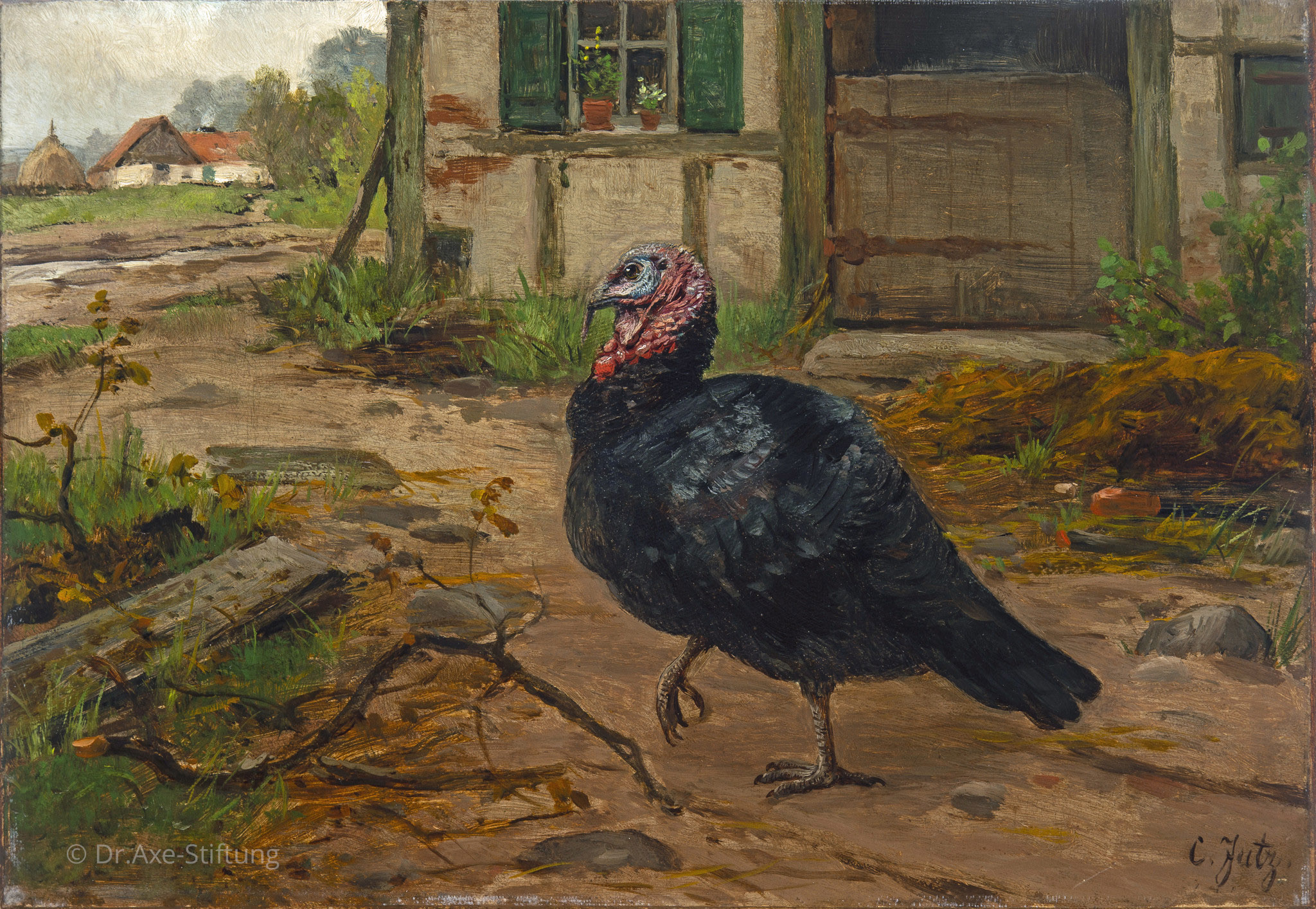 Die Fokussierung auf ein einzelnes Tier ist ungewöhnlich für Carl Jutz. Möglicherweise handelt es sich bei dem Bild um eine Auftragsarbeit für einen Truthahnliebhaber, schließlich konnten sich vor allem Engländer und Amerikaner für Jutz‘ Werke begeistern. Denkbar wäre aber auch, dass der Truthahn ursprünglich als Skizze für eine größere Komposition gedacht war, dann aber so überzeugend gelang, dass der Künstler nachträglich einen Hintergrund um das Tier malte.