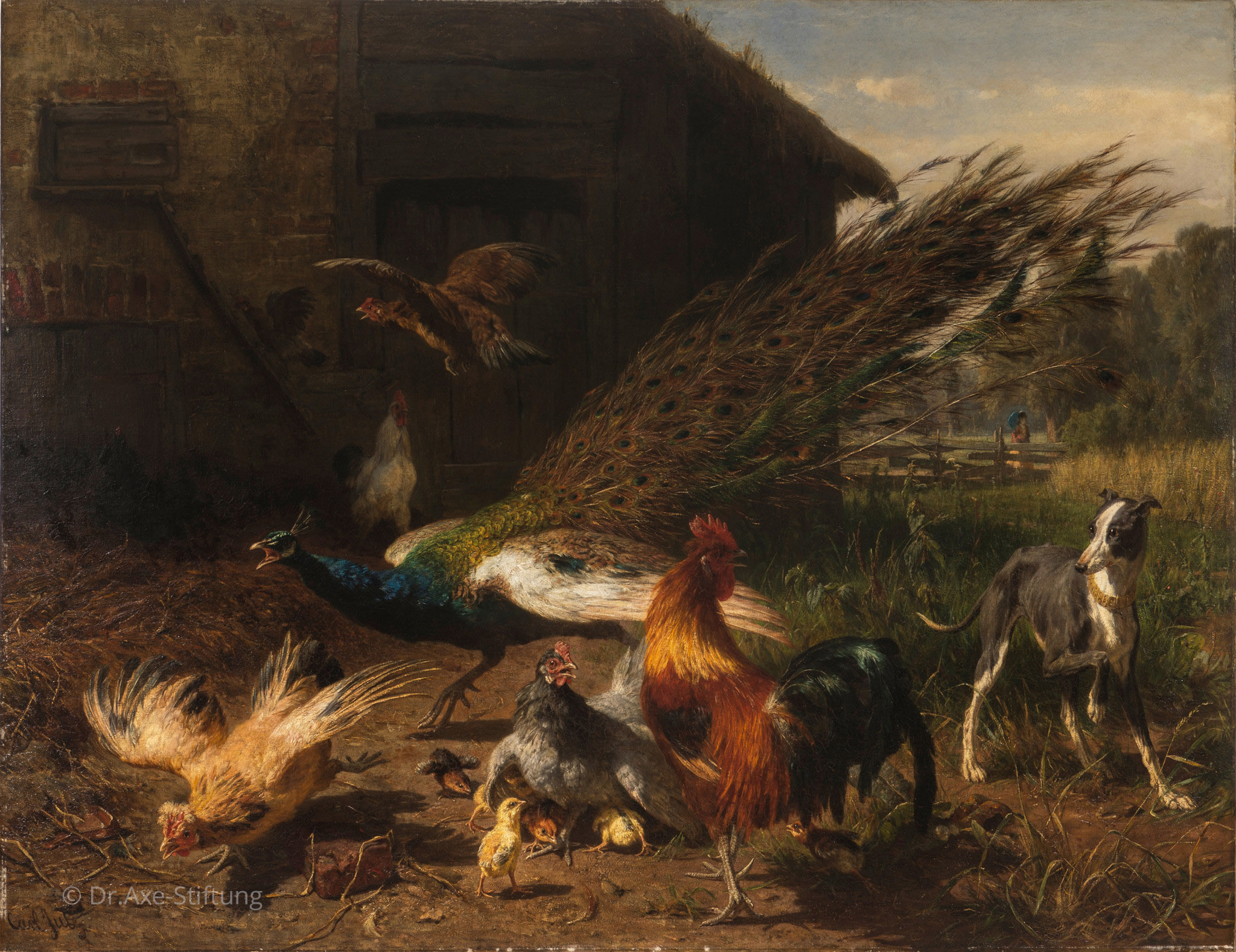 Jutz variierte die Szene vor einem Hühnerstall in verschiedenen Bildern, unter denen sich die hier ausgestellte Fassung durch ihre sorgfältige technische Ausführung und den anekdotischen Charakter besonders auszeichnet. Der geöffnete Schnabel des Hahns lässt vermuten, dass dieser soeben zu einem kräftigen Kikeriki angesetzt hat, doch noch mehr Krach scheinen die sich streitenden Muttertiere – ein Huhn und eine Ente mit ihren Küken – rechts auf dem Mist zu machen.