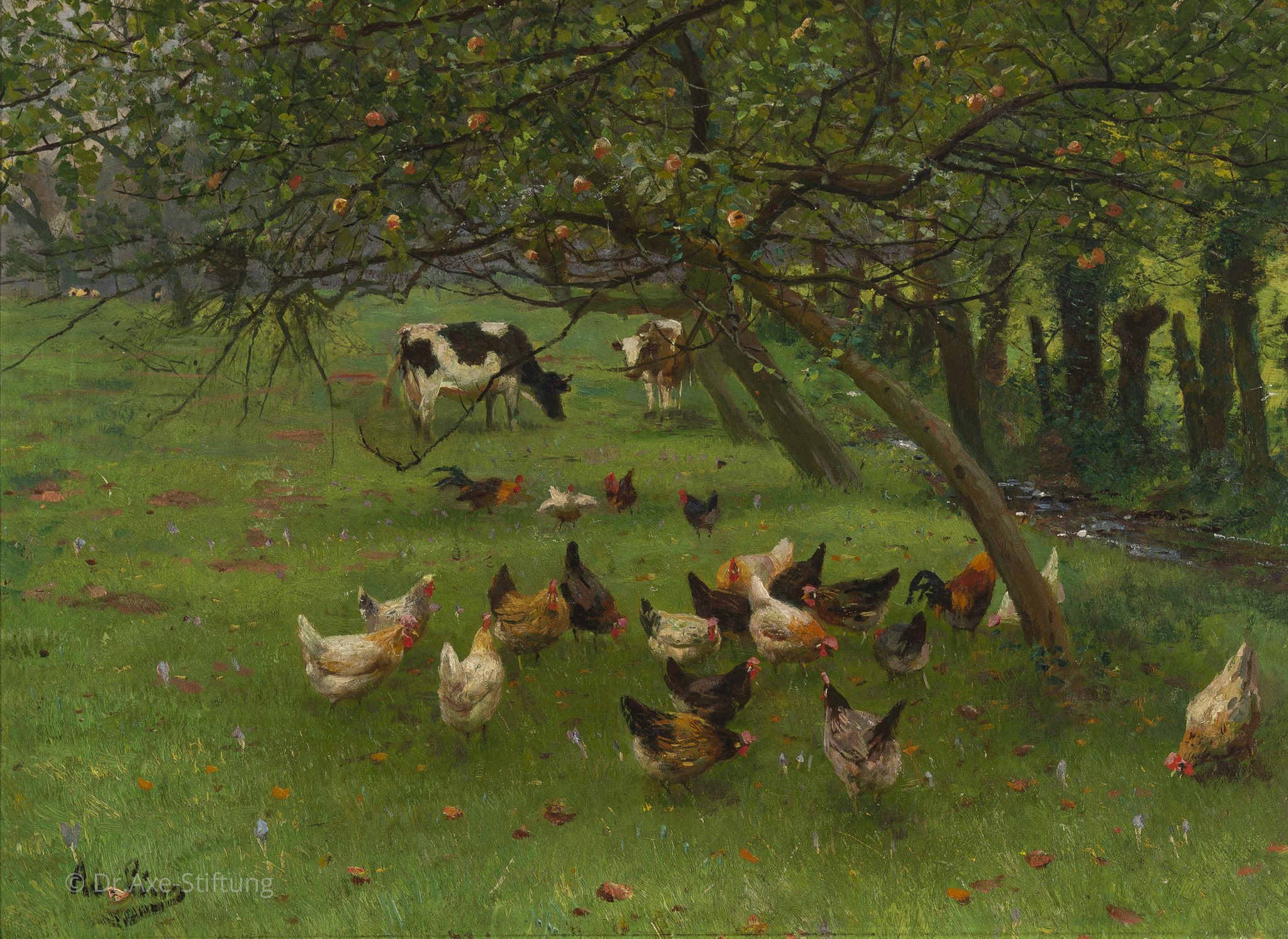 Mehr als 20 Hühner halten sie unter dem Apfelbaum auf. Ihre roten Kämme und Kehllappen setzen vor der grünen Wiese ebensolche Komplementärkontraste wie die roten Äpfel. Lins malte die ländliche Szene schnell mit sicher aufgesetzten Farbtupfen und weist sich zugleich als ein genauer Beobachter der Tiere im Freien aus.