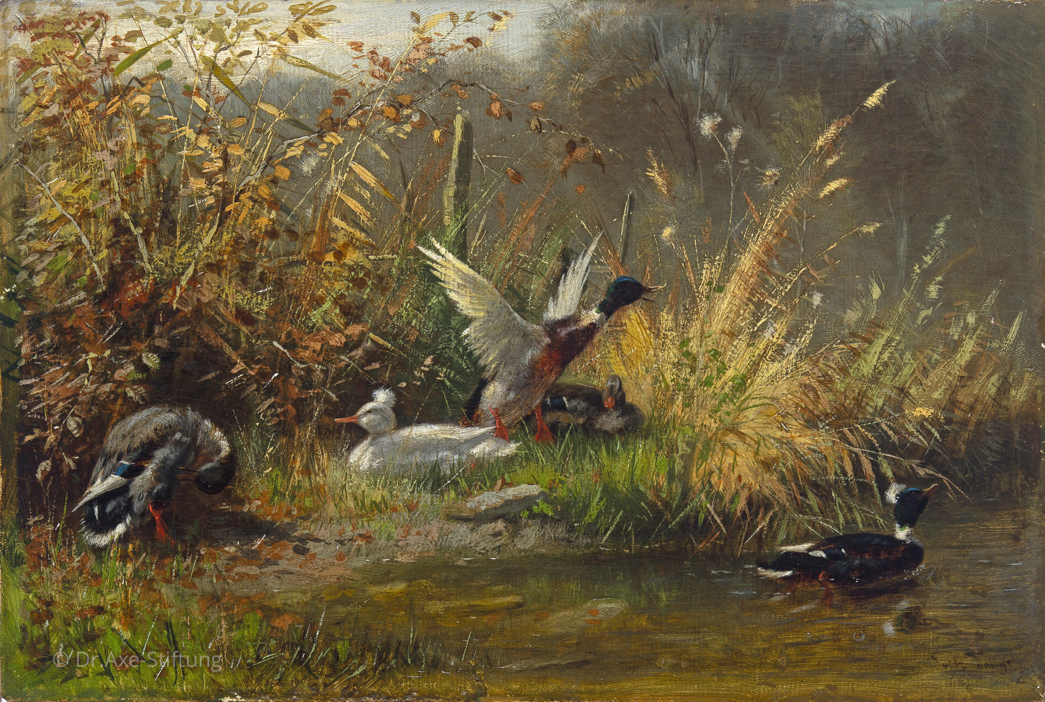 Das dynamisch wirkende Gemälde „Revierkampf“ zeigt den Konflikt zwischen zwei rivalisierenden Erpeln. Das Ufer ist wild mit herbstlich gefärbten Sträuchern bewachsen, die Fritz Lange schnellen Pinselstrichen festgehalten hat. Der Feinmaler passte seinen Malstil hier offensichtlich an das Thema an.