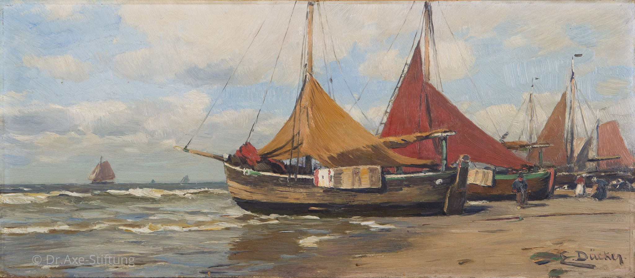 Mehr als 40 Jahre lehrte Eugène Dücker Landschaftsmalerei an der Düsseldorfer Kunstakademie. Wie kein anderer Professor prägte er mit seinem konsequent realistischen Kunstverständnis die Düsseldorfer Landschaftskunst im späten 19. und frühen 20. Jahrhundert. Zu seinen zahlreichen Schülern zählen unter anderen die in unserer Ausstellung vertretenen Maler German Grobe, Heinrich Hermanns, Olof Jernberg, Eugen Kampf und Helmuth Liesegang. Dücker fand seine Motive stets im Freien. Seine Reisen, die er oft in Begleitung von Schülern und Malerfreunden unternahm, führten ihn in den Harz, die Rhön und die Oldenburger Heide und regelmäßig hielt er sich an der Nord- und Ostsee auf. 7 Kunstwerke