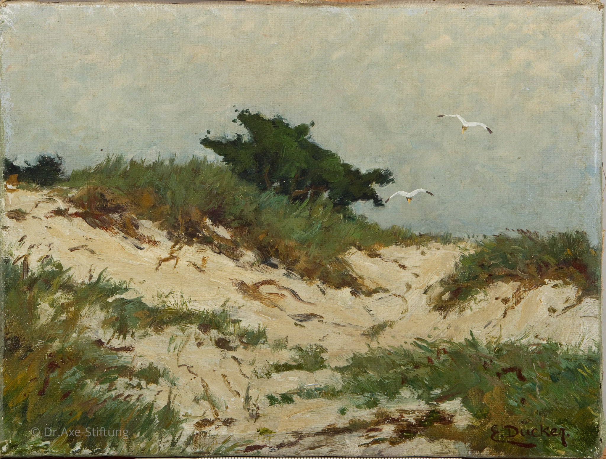 Ob Dücker die Dünen-Studie mit den zwei kreisenden Möwen auf Sylt oder einer anderen Insel malte, ist nicht überliefert. Ihm ging es bei diesem eng gefassten Bildausschnitt auch nicht darum, einen bestimmten Ort darzustellen, vielmehr wollte er eine spezifische Stimmung in der Natur erfassen. Dücker schuf derartige Ölstudien nicht nur für den Ateliergebrauch, sondern sah in ihnen eigenständige Kunstwerke, was nicht zuletzt die Signatur unten rechts belegt.