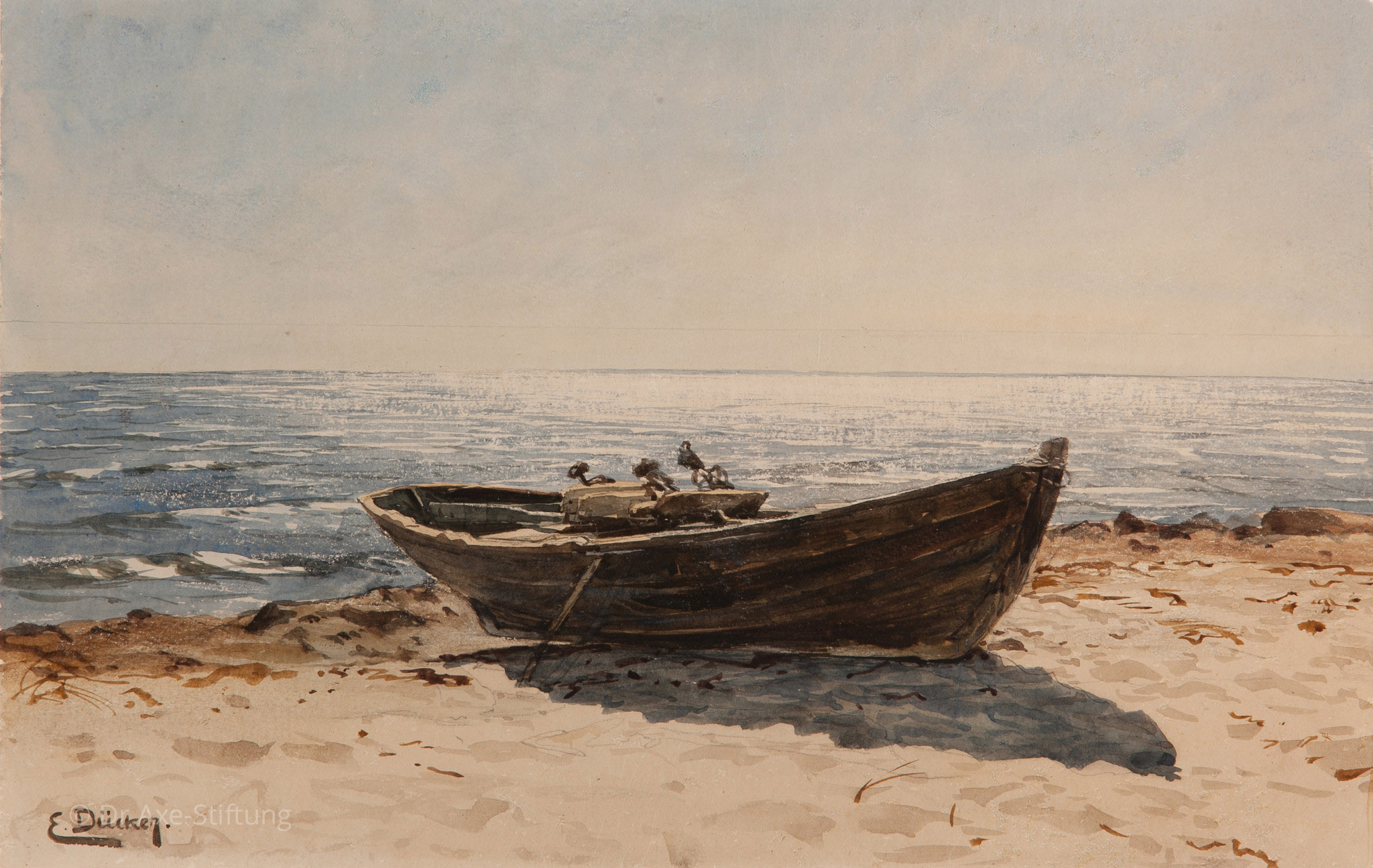 Bei genauer Betrachtung wird deutlich, dass Dücker die Komposition zunächst mit schnell gesetzten Bleistiftstrichen vorgezeichnet hat. Er ließ den Strand leicht nach rechts ansteigen und schichtete Land, Wasser und Himmel in lang gezogenen Keilen übereinander. Das Boot im Bildzentrum vermittelt zwischen den Elementen und trägt mit seinem blauen Schatten zur räumlichen Wirkung der Komposition bei.