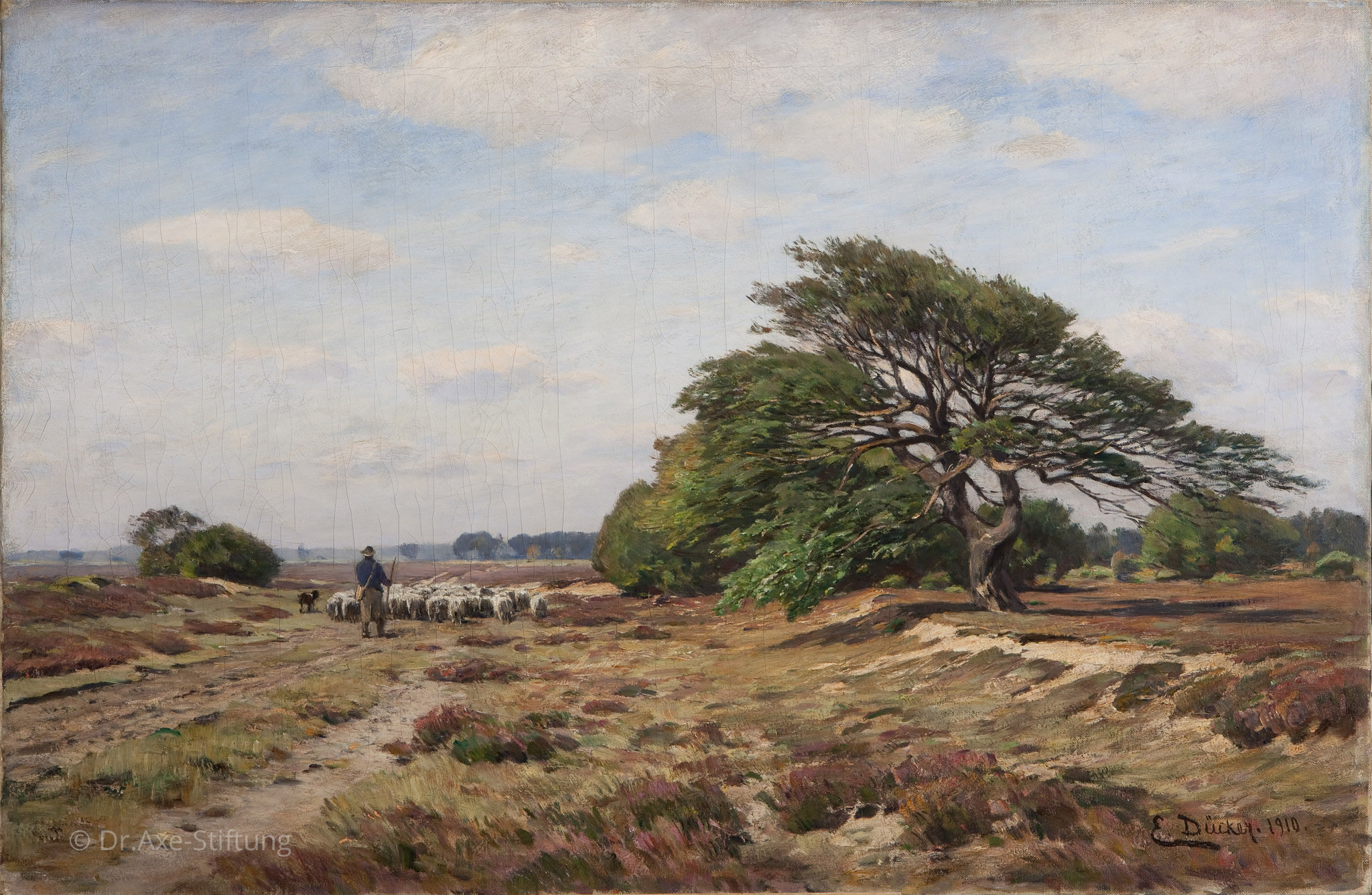Das relativ großformatige Dünenbild mit dem Schäfer und seiner Herde entstand 1910. Ein Aufkleber auf der Rückseite belegt, dass der Künstler für das Bild 1.400,- Mark von der Germania Brauerei in Dortmund erhalten hat. Die senkrecht verlaufenden Risse in der Malschicht lassen vermuten, dass die Leinwand einst vom Keilrahmen abgespannt und aufgerollt worden ist.