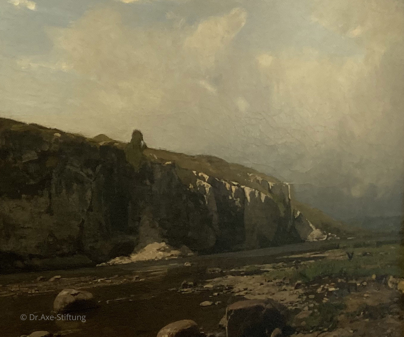 Die Motive für seine Landschaftsgemälde fand Eugène Dücker stets im Freien – im Harz, in der Rhön und der Oldenburger Heide ebenso wie an der Nord- und Ostsee, wo er sich regelmäßig aufhielt. Vor allem die Insel Rügen mit ihrer Steilküste bot ihm Motive für zahlreiche stimmungsvolle Bilder. So zeigt auch diese weitläufig angelegte, menschenleere Landschaft die berühmten Kreidefelsen am Kap Arcona im Norden der Insel mit der steinübersäten Strandregion im Vordergrund.