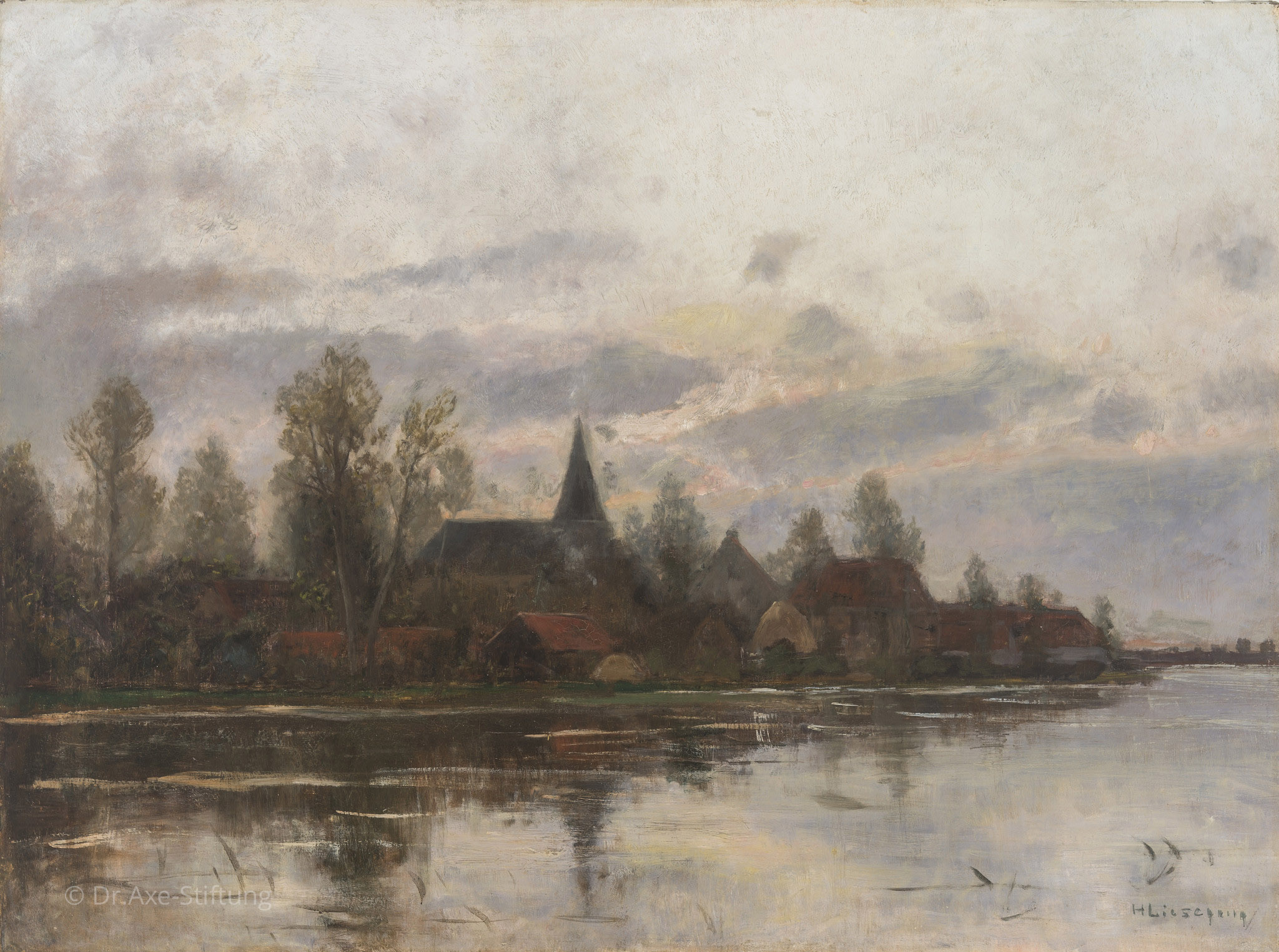 Liesegang zählte zu jenen Mitgliedern des Künstler-Clubs Sankt Lucas, die ausschließlich als Landschaftsmaler tätig waren. Von der flachen Landschaft am Niederrhein wurde er zu zahlreichen Bildern inspiriert: Bei der hier ausgestellten Ansicht handelt es sich um eine jener typischen Flusslandschaften mit einem am Ufer liegenden Dorf, das sich keilförmig von links nach rechts in die Bildfläche erstreckt. Die matten Grau-, Blau- und Violetttöne charakterisieren ebenso wie das Spiegelbild des rötlich gefärbten Himmels den zu Ende gehenden Tag.