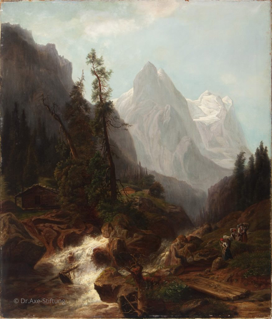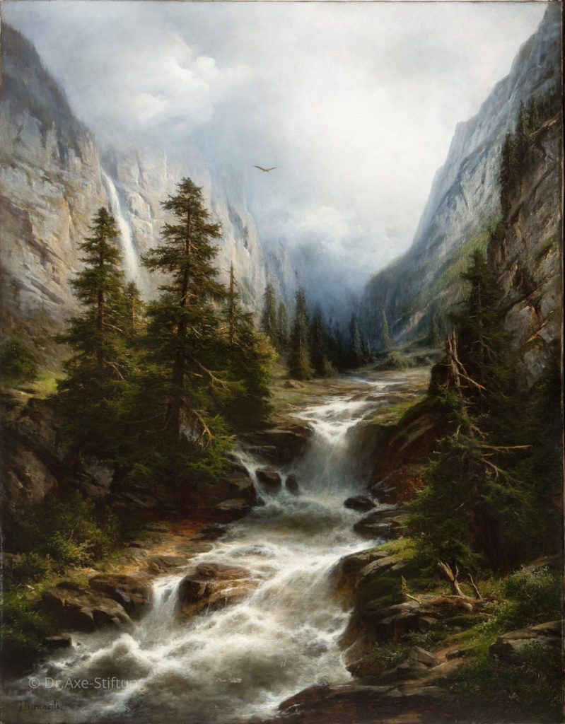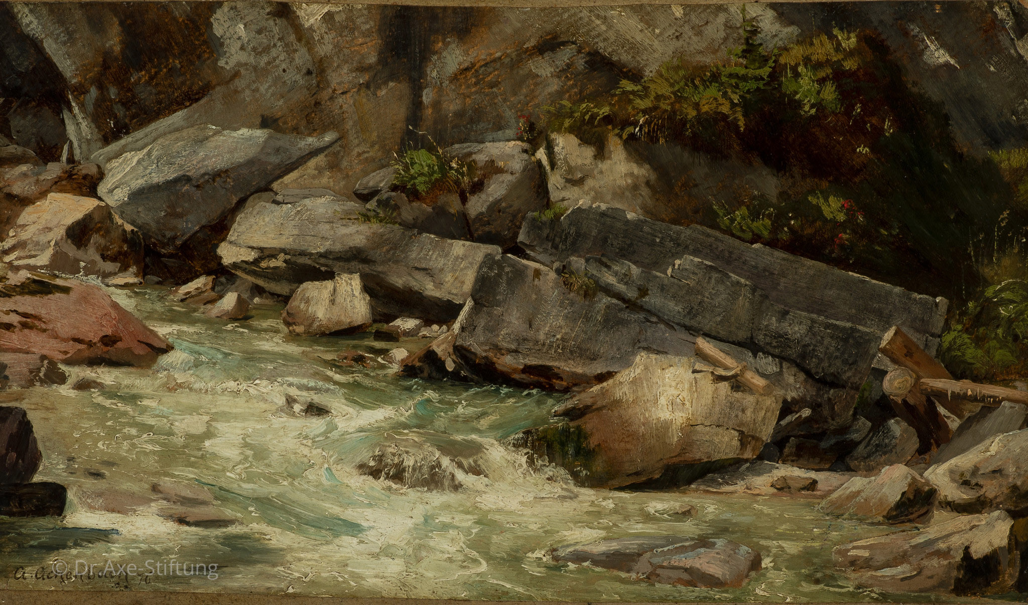 Einen sprudelnden Bachlauf im Freien darzustellen, war eine besondere Herausforderung, der sich Andreas Achenbach auch im Alter von 61 Jahren noch stellte. Mehrfach überquerte der Künstler die Alpen. Seine Malutensilien hatte er immer im Gepäck.