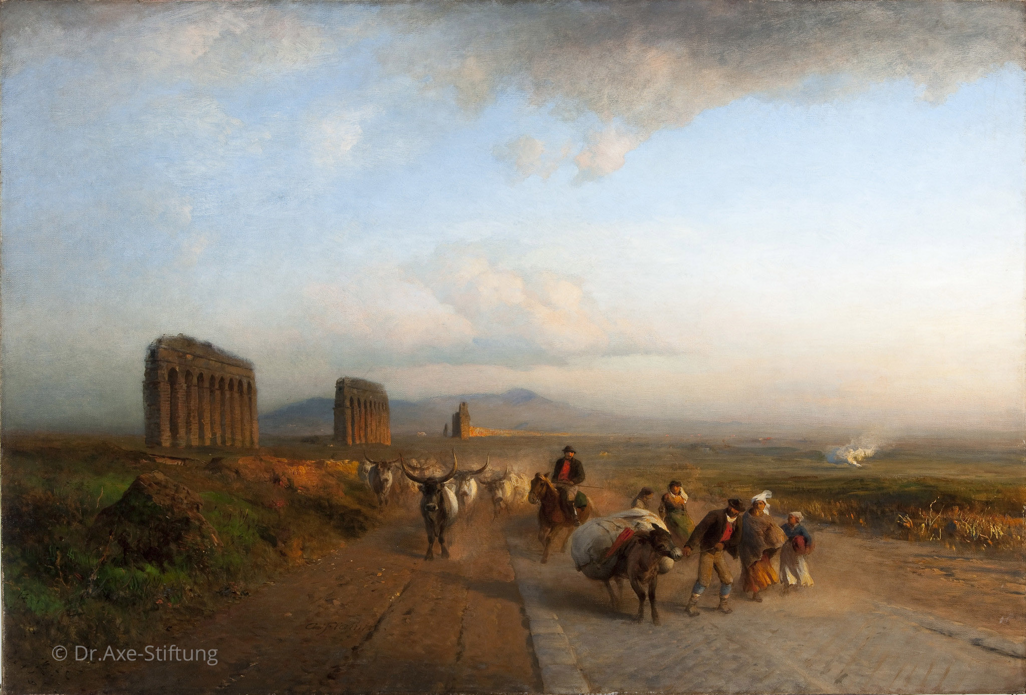 Die antiken Straßen und die Reste des römischen Aquädukts vor den Toren Roms zählen zu den beliebtesten Motiven der Maler im 19. Jahrhundert. Albert Flamm setzt die breite, gepflasterte Straße mit der Ochsenherde ins Zentrum des Bildes. Die auf den Betrachter zukommenden Tiere mit ihren Begleitern steigern die räumliche Wirkung der Landschaft, die mit Hilfe des warmen, mediterranen Lichtes in ein bühnenhaftes Panorama verwandelt wird.