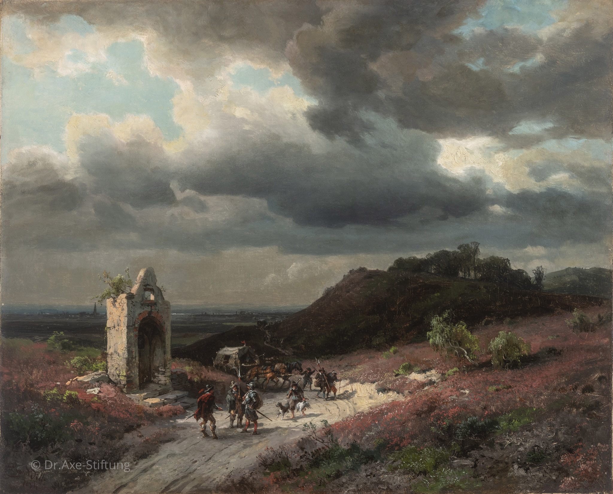 Gezeigt wird der Blick vom Grafenberg östlich von Düsseldorf auf die weite Rheinebene. Auf der Landstraße ist vor einem ruinösen Heiligenhäuschen eine Gruppe von Landsknechten in Uniformen des 17. Jahrhunderts dargestellt. Bei dem Bild aus dem Jahr 1854 handelt es sich um eine größere, um die Figurenszene bereicherte Fassung der 1853 datierten Ölstudie in der Sammlung der Dr. Axe-Stiftung.