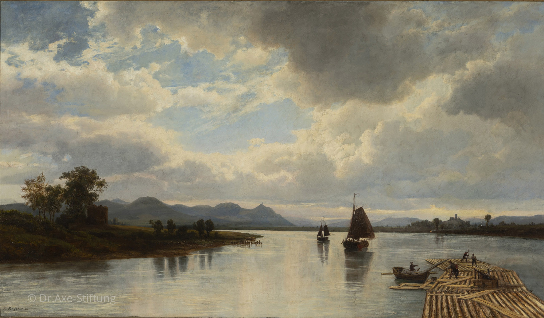 Die großformatige, stimmungsvolle Flusslandschaft ist über die gesamte Bildbreite angelegt. Ein aus langen Baumstämmen bestehendes und von drei Männern gesteuertes Floß dominiert in der rechten Bildhälfte. Die Flößerei auf dem Rhein war seit dem 18. Jahrhundert geläufig. Sie diente vor allem zum Transport von Holz, das zum Hausbau, zur Herstellung von Gebrauchsgegenständen oder auch als Brennmaterial benötig wurde.