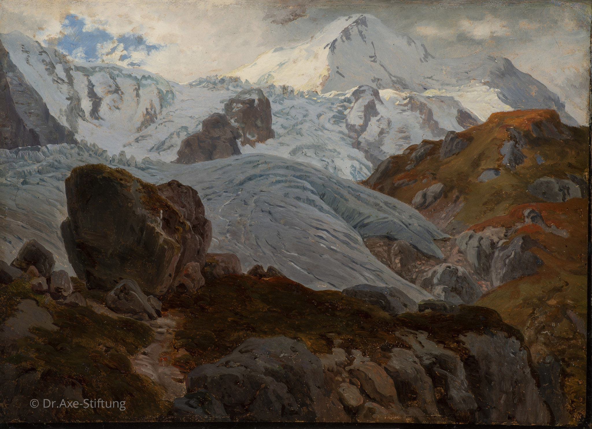 Das Bild zeigt eine Ansicht des Wetterhorns im Berner Oberland. Während die hell ausgeleuchtete Gletscherzone in Grau- und Weißtönen erstrahlt, ist das Tal im Vordergrund in erdigen Grün- und Brauntönen gehalten. Hier stürzt der tosende Gebirgsbach in die Tiefe.