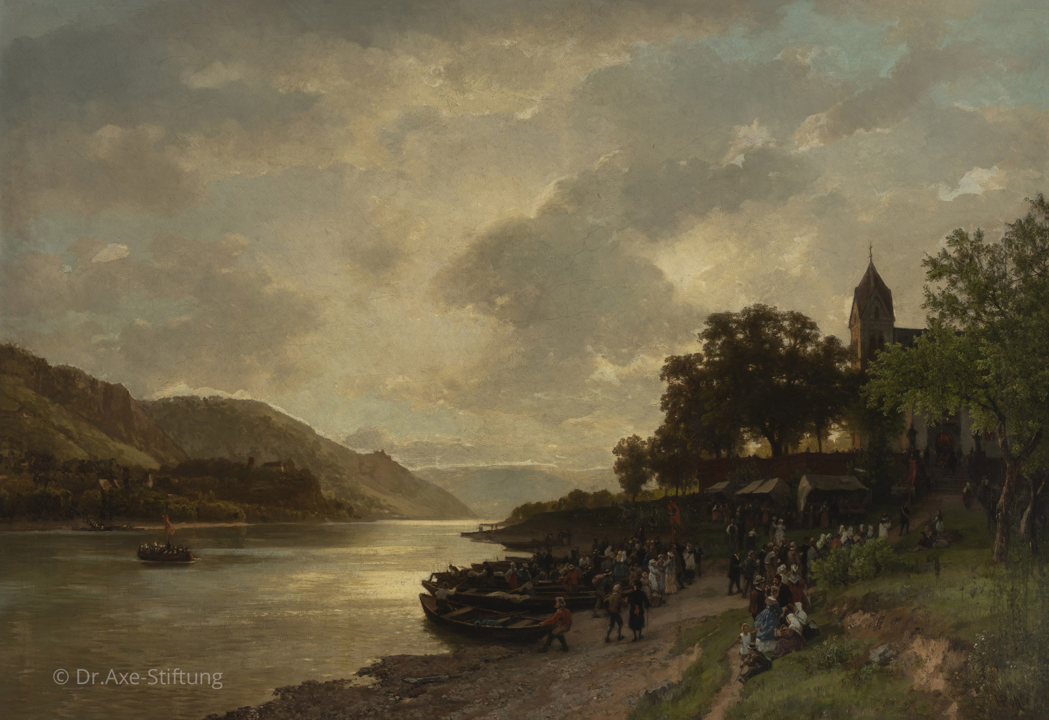 Eine Beschriftung des Bildes fehlt, doch die topografische Lage und die romanische Architektur legen nahe, dass es sich bei dem Gemälde um die Darstellung einer Wallfahrt zum rechtsrheinisch gelegenen Franziskanerkloster Bornhofen in Kamp-Bornhofen im Oberen Mittelrheintal handelt. Die Tradition der Wallfahrten in Bornhofen geht bis ins 13. Jahrhundert zurück.