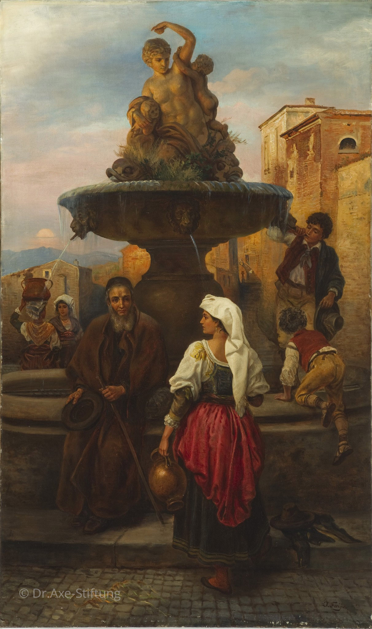 Im warmen Licht der untergehenden Sonne haben sich Frauen, Kinder und ein Bettler vor römischer Kulisse an einem Brunnen eingefunden. Ruhig und in sich gekehrt sitzt der graubärtige Bettler am Rand des Brunnens. Stock und Hut hält er in den Händen. Von rechts tritt eine junge Frau heran, um einen Krug mit Wasser zu füllen.