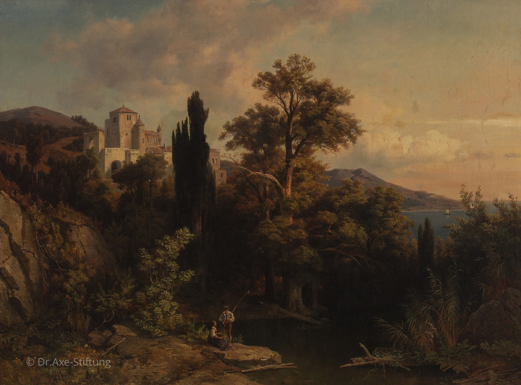 Alljährlich hielt sich Johann Wilhelm Lindlar in der Schweiz und in Italien auf. Neben der Schweizer Bergwelt gehörten die Seen in Oberitalien zu seinen bevorzugten Motiven. Typisch ist das warme, mediterrane Licht, das die Landschaft in einen stimmungsvollen Sehnsuchtsort verwandelt.